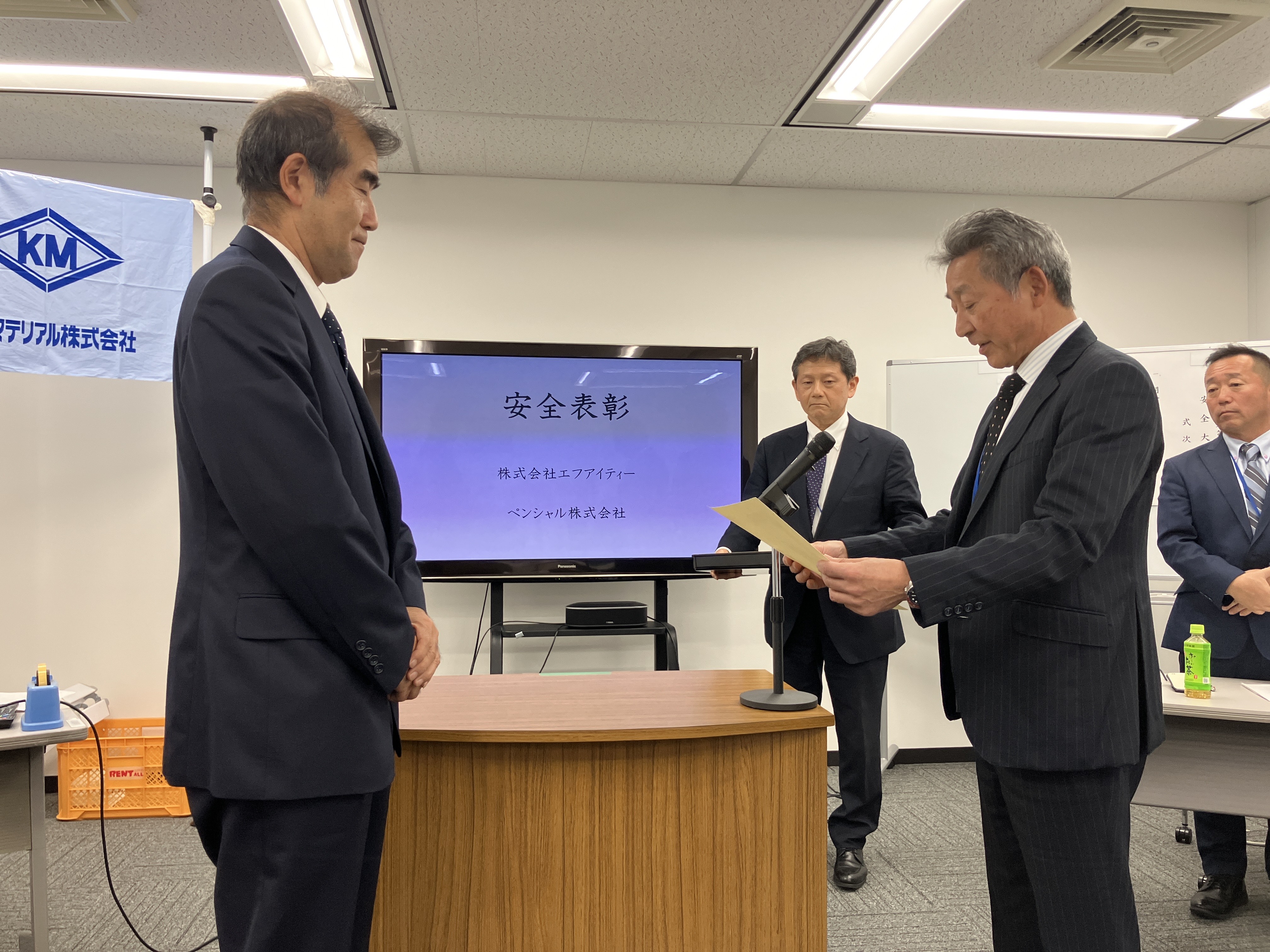 今回の安全大会では、過去一年間において特に優れた安全管理を実践した協力業者様が表彰されました。受賞者は、ペンシャル株式会社様と、株式会社エフアイティー様でございます。現場での安全作業において卓越したリーダーシップを発揮し、無事故での作業を継続したことが評価されました。工事現場で最も大切な安全について、日々注力し、これからも、現場での連携を大切にし、引き続き安全作業に努めて頂けると幸いでございます。